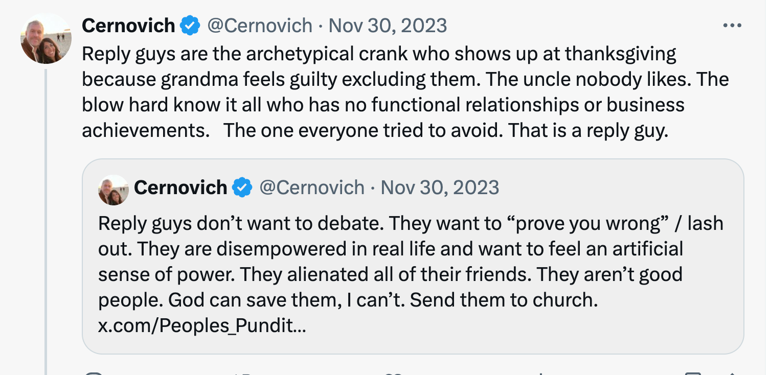 And I'm all for not entertaining fools, or as the saying goes, "lie down with dogs, get up with fleas." There's a whole bunch of miserable souls itching to drag others into their pit of despair. They find some twisted sense of power in being "reply guys" because, to be candid, they've got nothing else going for them.